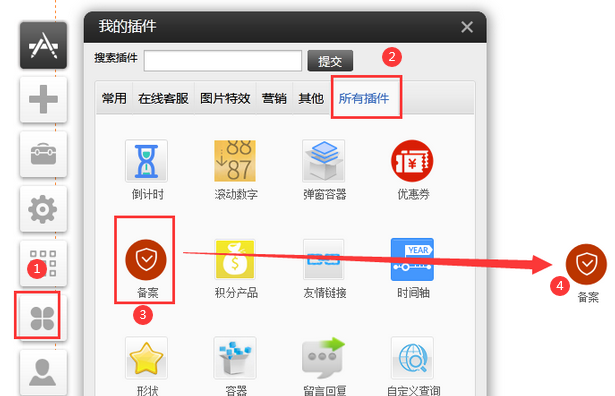 可用版本:基礎版,標準版,營銷版①.備案插件,常用或者所有插件里面可以看到②.拖出備案插件到編輯區(qū)域,選擇備案類型③點擊樣式設置,可以輸入備案號相關信息,并且可以設置文字的樣式,包括懸停樣式④.備案插件已經鏈接到信息產業(yè)部備案管理系統(tǒng)網址,用戶只需要填寫備案號信息即可,方便客戶操作手機版用法同上,不再贅述如果要放置在頁腳,點擊屬性勾選為頁腳元素然后拖拽到頁腳保存即可。以上工信部備案流程已經完成。如果要添加的備案是公安備案類型請參考以下步驟。選擇公安備案類型填公安備案號和對應鏈接。保存即可2分鐘添加