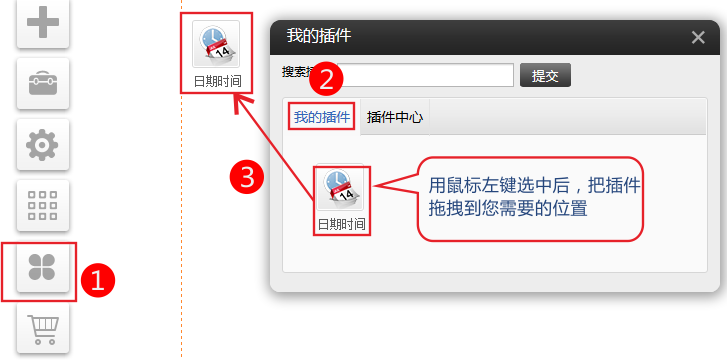 PC和手機版(適用版本基礎版、標準版、營銷版) 1、依次點擊插件-我的插件-選中“日期時間”插件拖拽到您需要的位置。(如果“我的插件”中沒有,請到插件中心選啟用) 2、點擊設置選擇需要的展示的樣式。 3、您也可以自定義展示樣式。 各符號的意義 年(YY=14YYYY=2014)月(MM=03MMMM=3月)日(Do=1日DD=01)星期(dd=一dddd=星期一) h=小時m=分鐘s=秒a=上午或下午 h=12小時H=24小時 hh,mm,ss=零起始h,m,s=非零起始 []=符號內輸入文字會直接顯示 4、設置后效果如下圖 5、