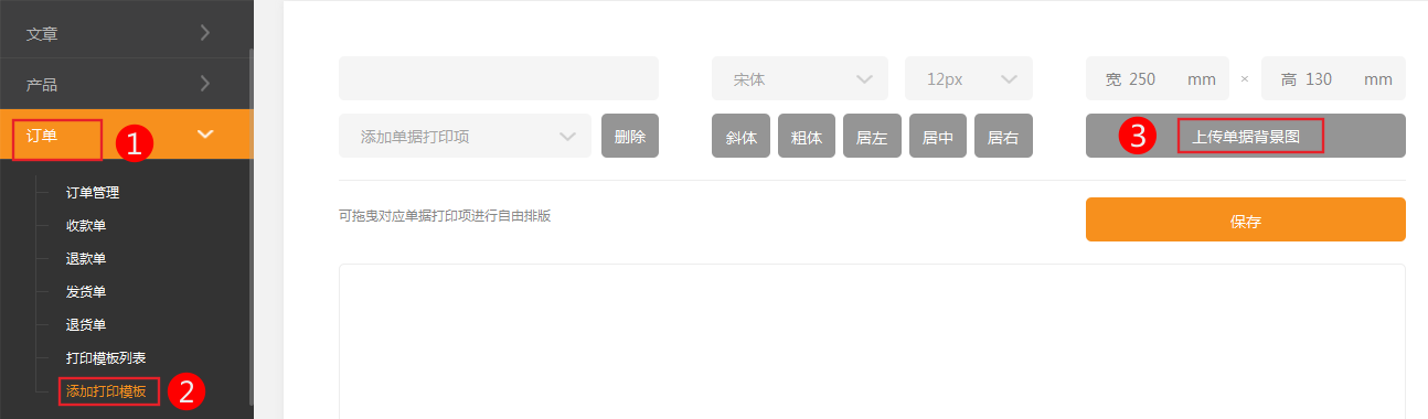 店主可以自己編輯、建立模板。本小節(jié)共包含2點。1、通過本部分的操作,您會對快遞單模板有深入的了解!添加新快遞單模板編輯快遞單模板一、添加新快遞單模板1.依次點擊訂單-》添加打印模板-》錄入單據(jù)名稱-》上傳單據(jù)的圖片會提示先上傳新單據(jù)的圖片圖片最好用分辨率高的掃描儀進行處理,效果會更好。分辨率建議在96dpi左右圖片上傳結束后,根據(jù)圖片中內容項位置添加相應打印項就可以。2、編輯快遞單模板如果對快遞單模板的內容不滿意,可以隨時進行調整在相應快遞單模板上點擊編輯會彈出訂單的編輯界面其中背景圖可以隨時更換!發(fā)貨信息及