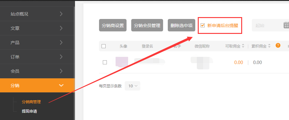 新申請后臺提醒在建站后臺,“分銷”-“分銷商管理”頁面新增了“新申請后臺提醒”的設(shè)置項,勾選后新的分銷商提醒即在右上角的提醒消息中顯示,如圖所示:分銷商管理分銷商傭金明細下級會員明細下級分銷商明細分銷會員管理依次點擊分銷-》分銷商管理-》分銷會員管理可以查詢會員屬于那些分銷商。項目pc手機微信公眾號app端營銷版小程序分銷店鋪不支持不支持支持不支持支持分銷功能支持支持支持支付,但僅支持詳情復(fù)制鏈接支持分銷店鋪滾動條是否支持取消無無不支持無不支持分銷中心店鋪設(shè)置中的圖片能不能修改不能不能不能不能不能廣告語