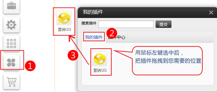 PC版插件(適用版本基礎(chǔ)版、標(biāo)準(zhǔn)版、營銷版) 1、依次點(diǎn)擊插件-我的插件-選中“營銷QQ”插件拖拽到您需要的位置。(如果“我的插件”中沒有,請到插件中心選啟用) 2、點(diǎn)擊設(shè)置,粘貼獲取的代碼。 3、保存后效果如下 如果加入后不顯示請檢查以下兩點(diǎn) 1.必須要有開啟了自動接入的工號在線(忙碌離開都不行) 2.自動邀請過一次,暫時不能再邀請,得用戶關(guān)閉網(wǎng)頁一陣,再打開才能邀請 4、最后記得在右上角點(diǎn)擊保存。 需要用認(rèn)獲取代碼時填寫的域名去訪問使用。