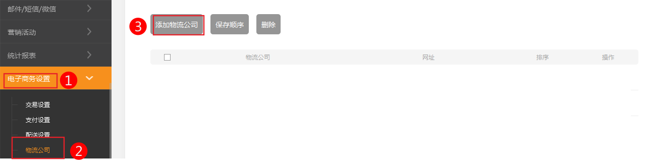 配送方式,指的是店主將顧客購買的商品,送到顧客手中所采用的運送方式,如:中國郵政EMS、門店自取等。 本小節(jié)共包含4點。1、通過本部分的設置,您可以設置不同省份分別自動計算費用的配送方式。 設置物流公司 設置配送方式 2、添加物流公司 物流公司會出現(xiàn)在配送方式及訂單信息中,供會員查詢物流狀態(tài),需要預先設置。 依次在后臺點擊電子商務設置-物流公司點擊添加->錄入公司名稱和網(wǎng)站地址 3、設置配送方式 1.依次點擊電子商務設置-》配送設置-》添加配送方式->物流公司從剛才添加好的列表中選擇