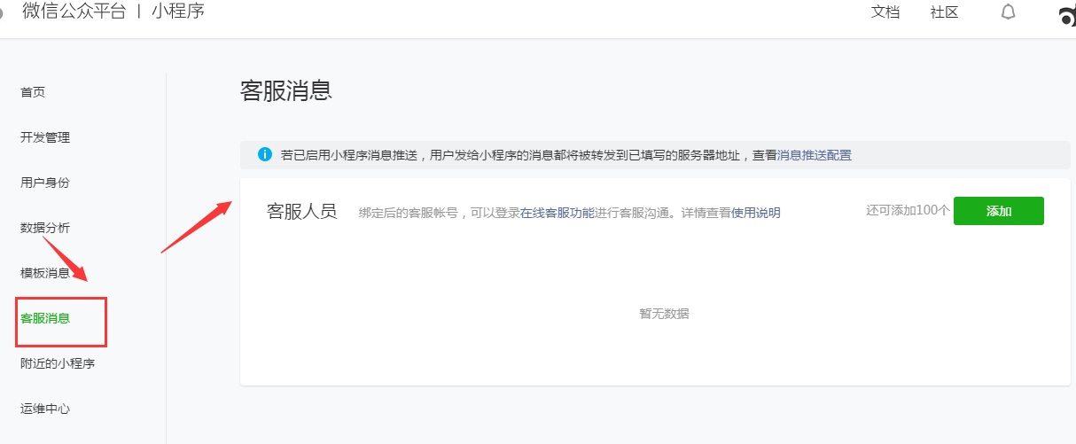 ①https://mp.weixin.qq.com/登錄小程序賬號,選擇客服消息,可以添加客服人員,最多可綁定100個②.完成客服人員的綁定之后,注意最多綁定100個客服賬號,登錄客服賬號③.已被綁定的小程序客服人員可掃碼登錄微信公眾平臺網(wǎng)頁版客服工具,并選擇對應的小程序帳號,登錄后即可看到與小程序?qū)υ挼挠脩簦蛇x擇接入對話。④.點擊在線狀態(tài),可以選擇在線狀態(tài)、離開狀態(tài)或退出登錄④.點擊右上角設置按鈕,可對接收消息進行基本設置手動接入:客服人員上線后,點擊“待接入”,即可在“待接入”列表中,手動接入待回復的對話自動接入:當待接