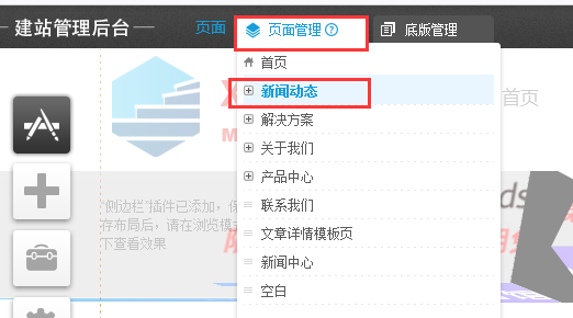 首先在上角頁面管理中找到不能鏈接的頁面,此例以新聞動態(tài)為例1.確定有沒有帶文章詳情插件的頁面找頁面中找到列表模塊點擊設置->鏈接設置鏈接頁面時下拉時沒有可選擇的項、說明就沒有帶詳情插件的頁面如果是文章按以下操作建立頁面頁面管理-》創(chuàng)建新頁面-》標題寫文章詳情模板-》底板選擇common或您自已建的-》導航顯示改為否-》然后保存保存后在側插件中心拖拽文章插件-》選擇詳情點確定調(diào)整文章詳情模塊大小一般高度在100px左右即可,系統(tǒng)會自動適應文章內(nèi)容,然后點擊右上角保存如果是產(chǎn)品按以下操作建立頁面頁面管理-》創(chuàng)建新頁面-