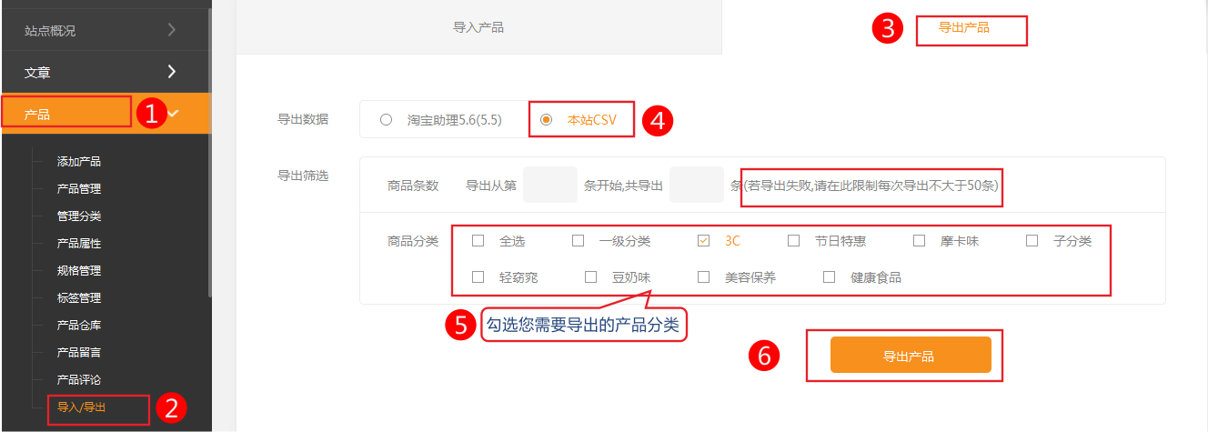 如果您已經(jīng)能夠熟練的添加復雜商品了,并且要添加的商品屬于同一個商品分類,則可以用批量上傳的方式一次性導入大量商品。本小節(jié)共包含以下幾點。通過本部分操作,您可以批量上傳具有相同商品分類的商品。確認網(wǎng)站中已經(jīng)有商品分類,及分類下有產(chǎn)品。然后選中一個此分類下的產(chǎn)品點擊批量導出,下載對應的CSV文件編輯商品分類的列的內(nèi)容編輯商品貨號的列的內(nèi)容商品圖片列的填寫編輯商品輔助信息列的內(nèi)容上傳編輯好的CSV文件并核實商品內(nèi)容注意:CSV文件可以通過Excel等軟件打開和編輯。(注意csv分隔符選擇制表符.)本操作的前提是