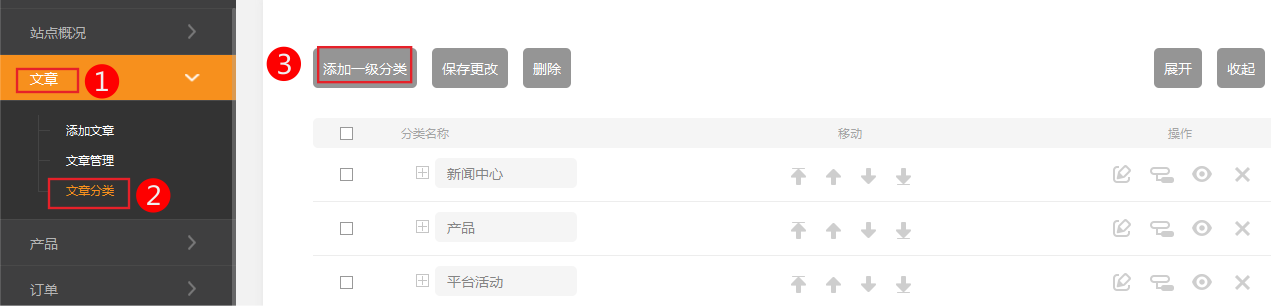 本小節(jié)共包含5點。1、看完本節(jié)內(nèi)容您應(yīng)該知道: 添加文章分類往往是第一步的,一個文章必須添加在一個分類下 添加分類以后,您可以對分類的順序進(jìn)行調(diào)整,讓您認(rèn)為重要的分類顯示在前面。 添加分類以后,您可以通過編輯這個分類來調(diào)整這個分類的層級關(guān)系 2、添加分類 1.依次點擊后臺管理-文章-文章分類 2.錄入頂級分類名稱,如果需要在頂級分類下添加子分類,直接點擊添加子分類即可。 如果還有添加頂級分類點擊添加一級分類即可 添加完完畢以后點擊保存更改,可以在分類列表中看到它 3、調(diào)整分類的顯示順序 可能