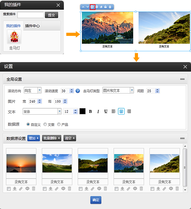 PC和手機(jī)版插件(適用版本基礎(chǔ)版、標(biāo)準(zhǔn)版、營銷版)使用方法:進(jìn)入網(wǎng)站編輯-〉點左側(cè)插件圖標(biāo)-〉插件中心,找到走馬燈插件圖標(biāo),點啟用以下是操作流程圖1、依次點擊插件-我的插件-用鼠標(biāo)左鍵選中走馬燈插件并拖拽到您需要的位置。如果插件沒有在“我的插件”中,請先到“插件中心”將插件啟用。啟用后在“我的插件”中,把插件拖到頁面中應(yīng)用。2、設(shè)置走馬燈的類型、方向、速度、樣式及數(shù)據(jù)源1支持走馬燈類型有:圖片+文本,僅圖片,僅文本2支持設(shè)置滾動方向:向左,向右,向上,向下。還可以自行設(shè)定滾動速3支持設(shè)置間距,圖片寬度和高