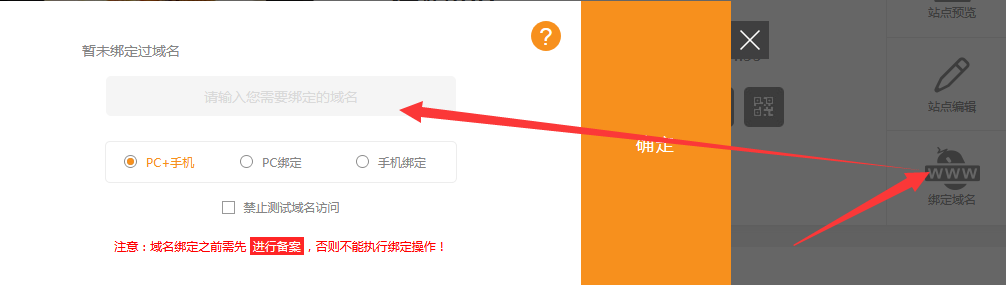 綁定類型詳解A綁定PC+手機(jī),訪問時做到自動識別,即:手機(jī)訪問就是手機(jī)網(wǎng)站,PC訪問就是PC版網(wǎng)站B綁定PC,通過PC或手機(jī)訪問時均看到PC版網(wǎng)站C綁定手機(jī),通過PC或手機(jī)訪問時均看到手機(jī)版建站注意綁定域名時填寫您帶www前綴的域名即可如www.qq.com注意:一般綁定域名需要綁定www前綴的域名