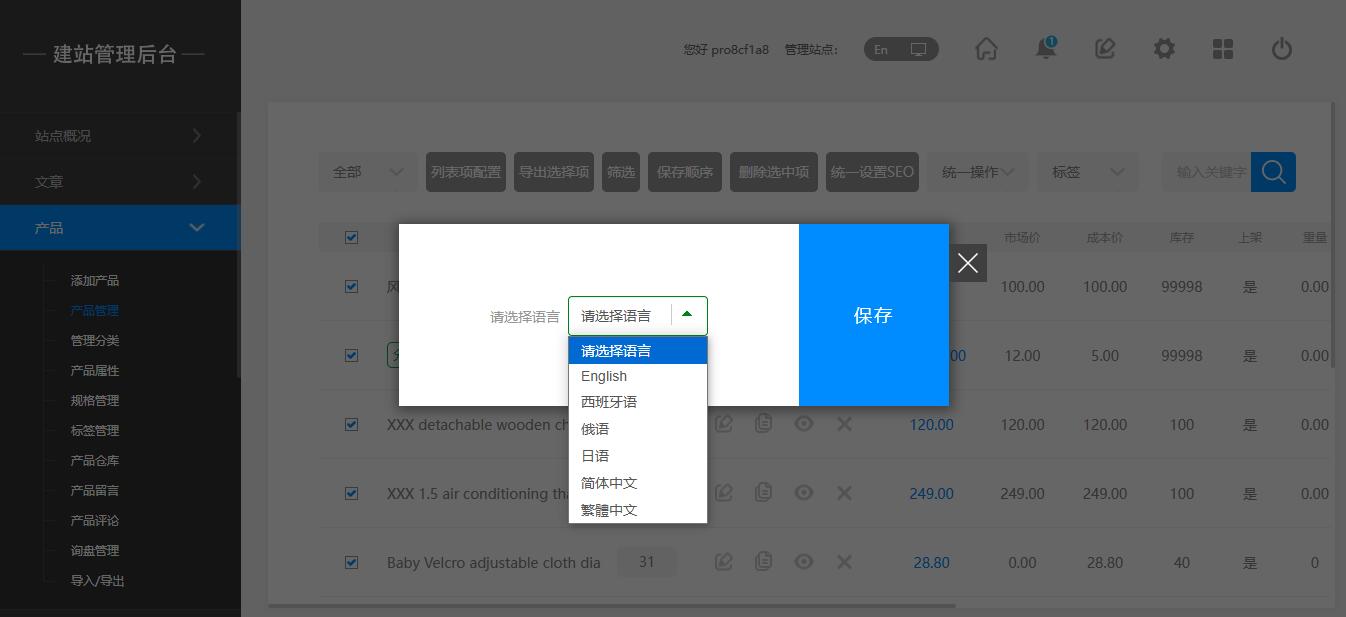 后臺:產(chǎn)品 — 產(chǎn)品管理 — 選擇產(chǎn)品 — 統(tǒng)一操作 — 批量復(fù)制 — 選擇語言站點(diǎn)