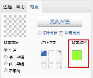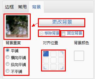 如果選擇使用圖片,則:點擊“更改背景”,從“我的圖片”中選擇對應(yīng)的圖片后即可直接生效;點擊“移除背景”將會刪除該背景;勾選“固定背景”則無論圖片尺寸多少,該背景相對于模塊的位置不變;左下角可以設(shè)置背景重復(fù)和對齊位置。