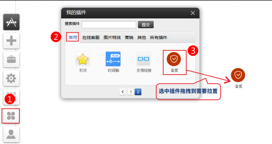 1、點擊 插件-》 選中“備案”插件,按鼠標左鍵不放,把模塊拖拽到您需要的位置。