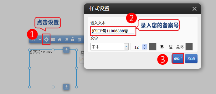 2、在模塊上方點擊設置-》錄入您的備案號,點擊確定。