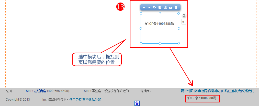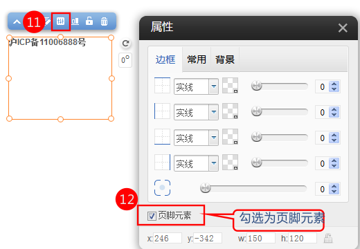5、將備案號元素拖拽到頁腳您需要的位置(注意必須在設置為頁腳元素后才能拖拽到頁腳)