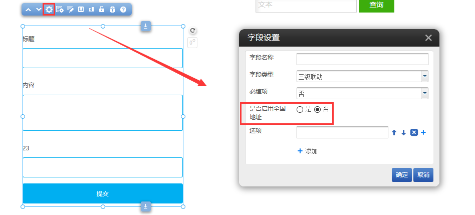 在建站前臺拖出“留言”-“留言表單”插件,點擊字段設(shè)置,字段類型選擇三級聯(lián)動,新增了是否啟用全國地址設(shè)置項,選擇是則會自動讀取地區(qū)信息。如圖所示: