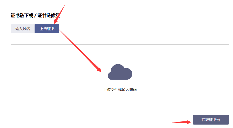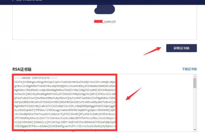 :安裝時需要將證書合并 如果自己不會合并,可以使用https://myssl.com/chain_download.html 將域名命名的那個crt文件證書放入上 傳證書中,然后獲取證書鏈,將整個獲取的證書鏈內(nèi)容作為 證書內(nèi)容寫入。
