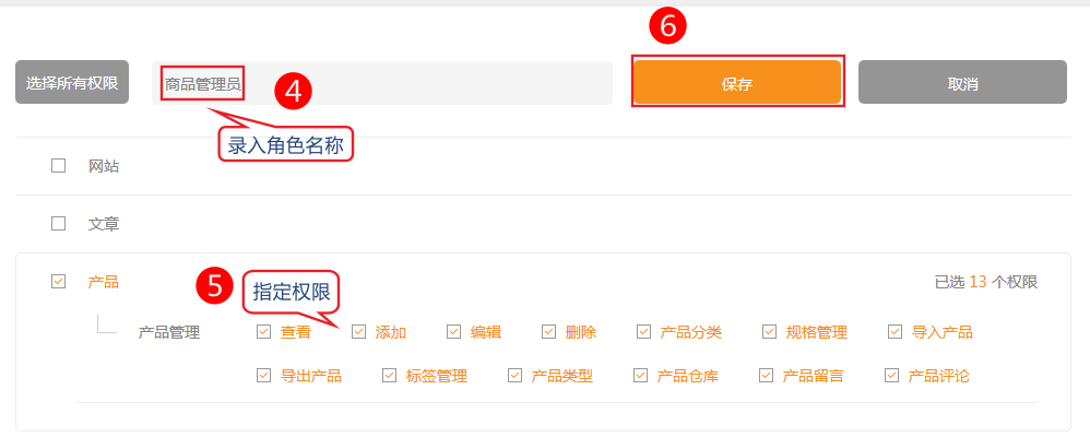 此角只有商品方面的權(quán)限。如果想再為這個角色增加其它權(quán)限.