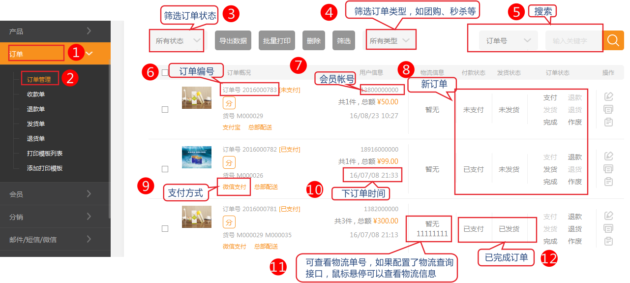 一般情況下,店主處理訂單的流程為:支付-->發(fā)貨-->完成。已取消在特殊情況下使用。