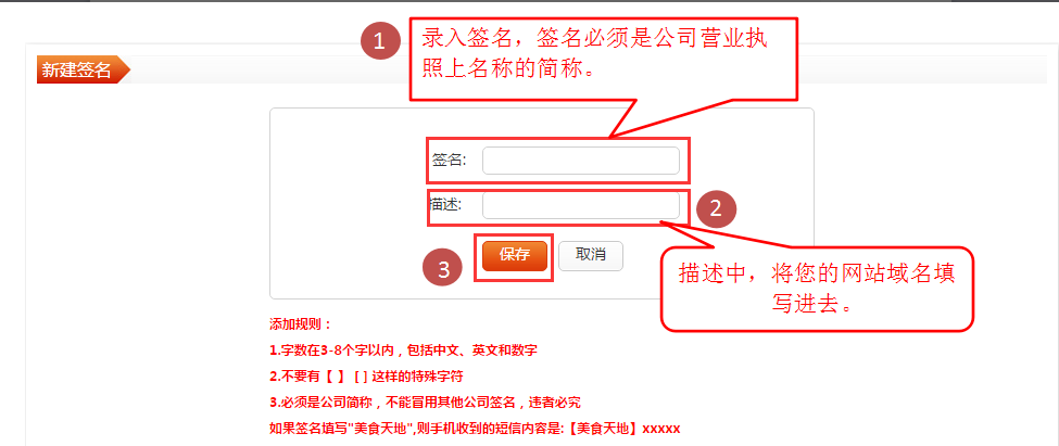 1.網(wǎng)站后臺(tái)設(shè)置完成之后需要在短信管理平臺(tái)進(jìn)行短信格式以及簽名的添加審核