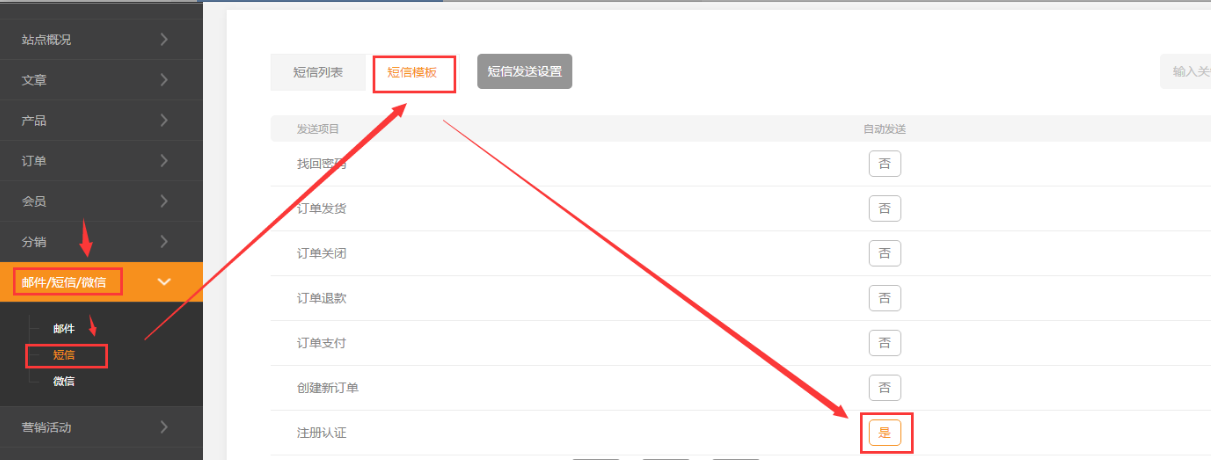 6.由于短信運(yùn)營(yíng)商,需要進(jìn)行測(cè)試審核,還必須參考截圖所示,將需要短信自動(dòng)觸發(fā)發(fā)送的設(shè)置項(xiàng)設(shè)置為啟用。