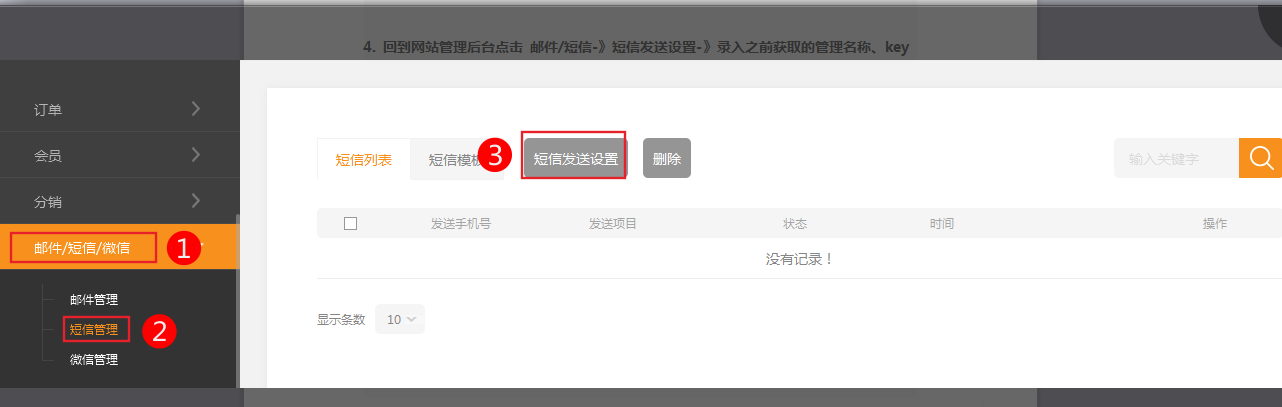 4. 回到網(wǎng)站管理后臺(tái)點(diǎn)擊 郵件/短信-》短信發(fā)送設(shè)置-》錄入之前獲取的管理名稱、key值、密碼和簽名