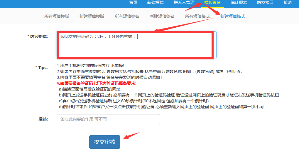 2. 還需要在短信管理平臺(tái)添加短信格式,通過審核后就可以在網(wǎng)站使用短信功能。