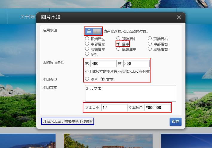 注意:開啟水印前上傳的圖片不會有水印的,只能新上傳的圖片才會產(chǎn)生水印