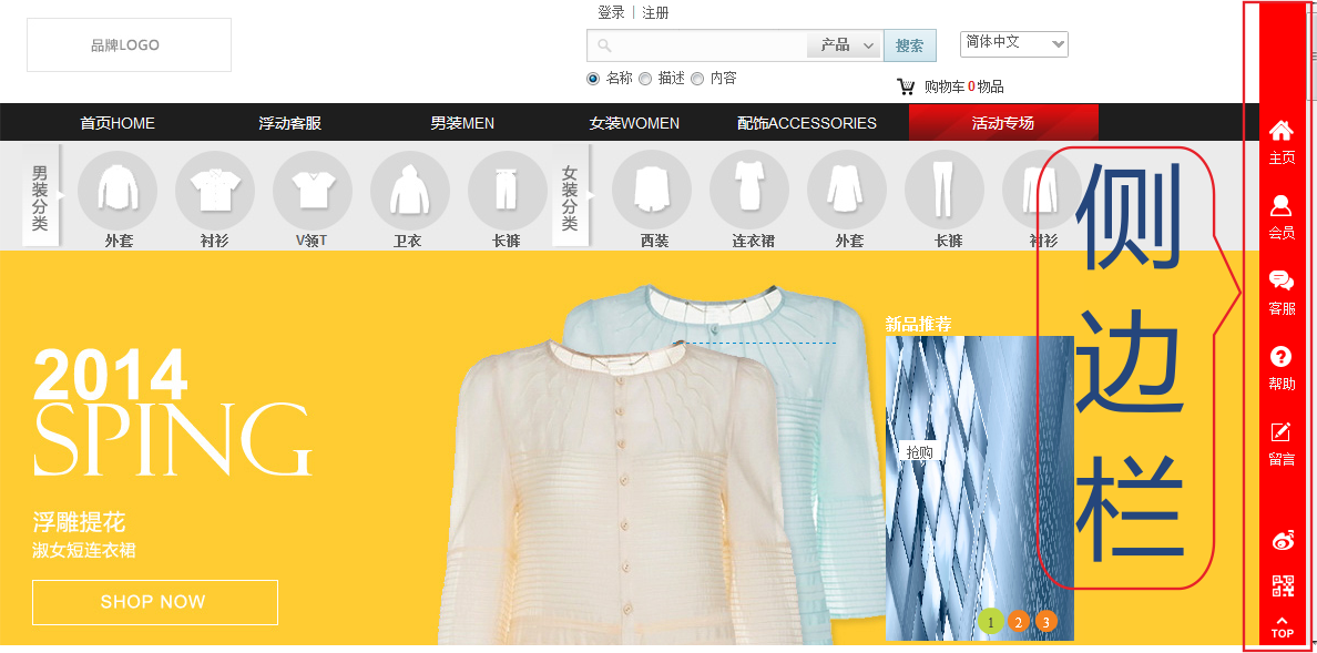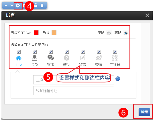 側邊欄內(nèi)容支持主頁、會員、客服、幫助、留言、微博、二維碼顯示在網(wǎng)站左側或右側。