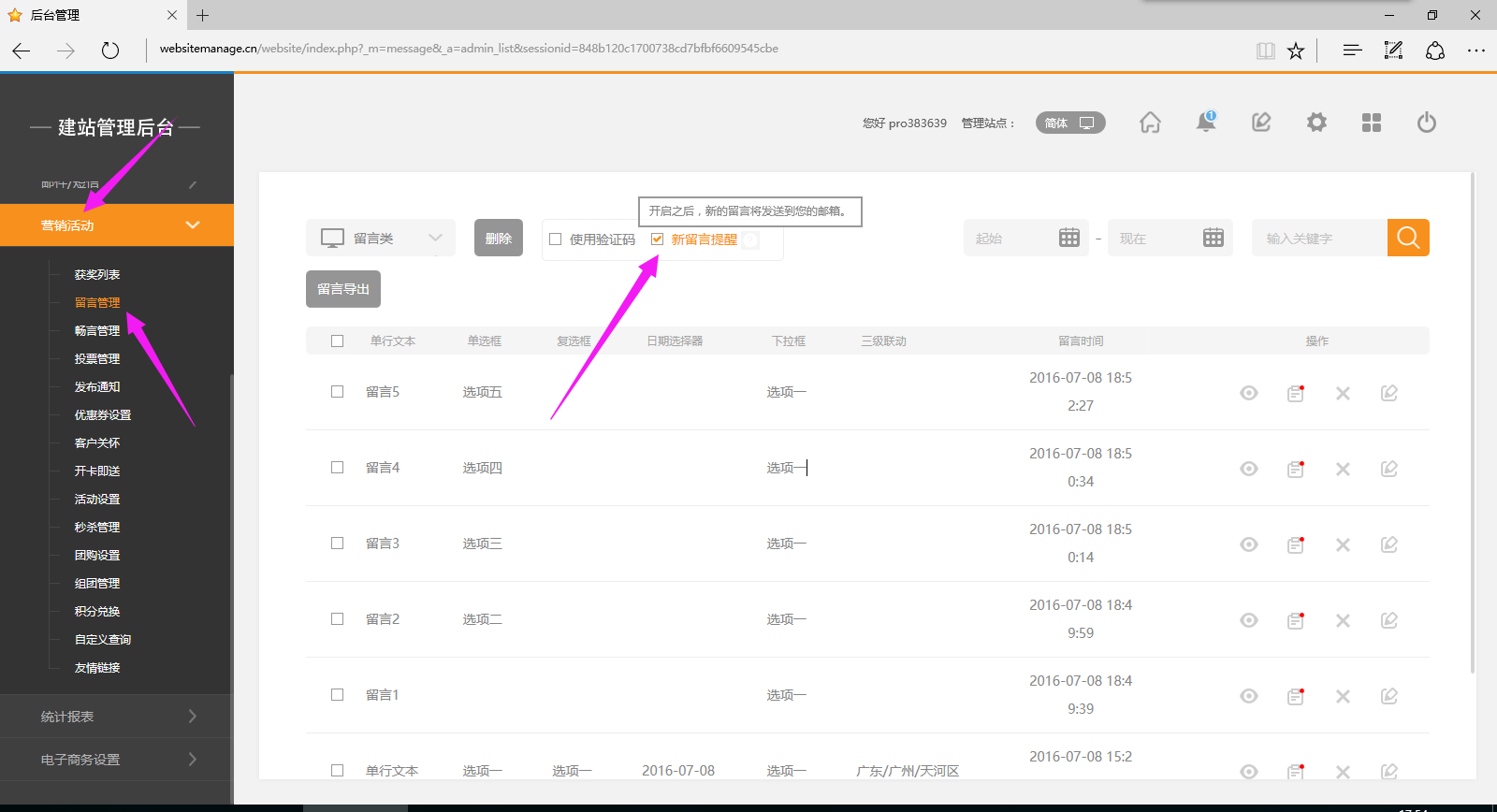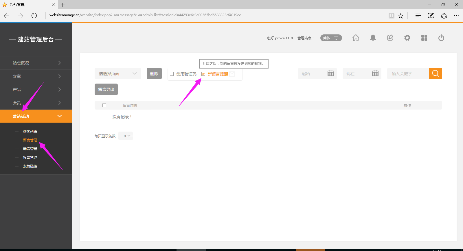 在網(wǎng)站后臺營銷活動->留言管理->勾選新留言提醒: