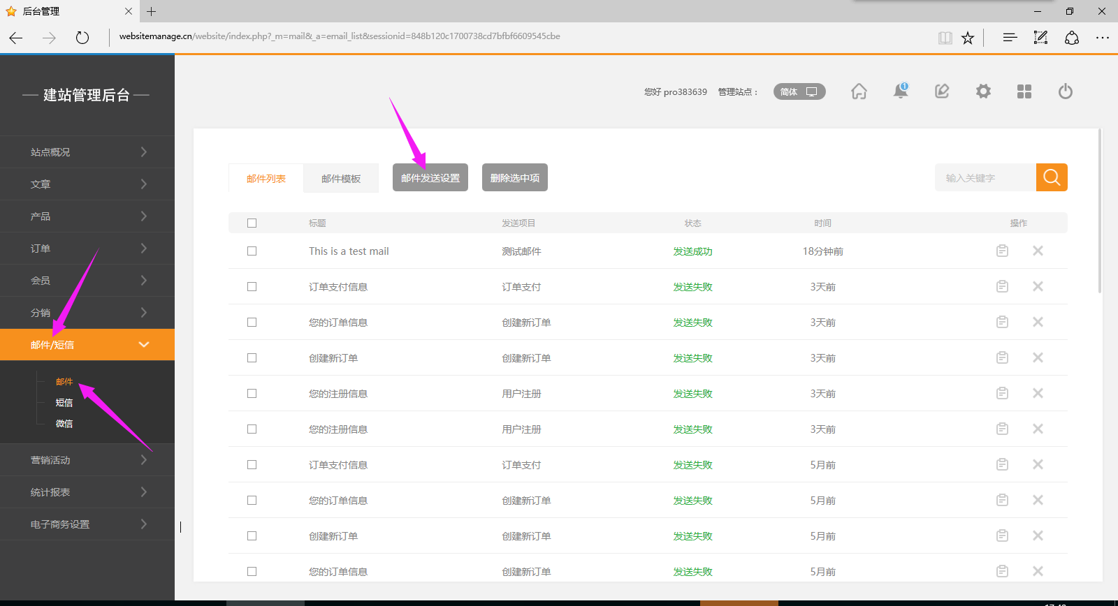 商店后臺,依次點擊郵件-》郵件發(fā)送設(shè)置 。