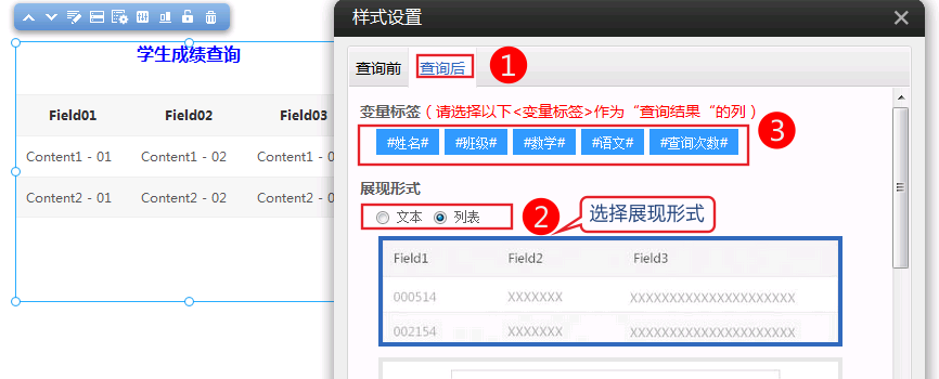 5.設(shè)置查詢后的樣式為列表,并錄入字段的變量標(biāo)簽如下圖: