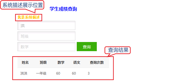 模糊查詢:輸入“姓名”“班級(jí)”“數(shù)學(xué)”其中一個(gè)條件,例如”小“,查詢結(jié)果會(huì)出現(xiàn)所有姓名中帶有“小”的內(nèi)容,如下圖: