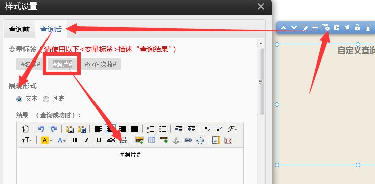 3、設(shè)置查詢后的樣式為文本、并錄入圖片字段的變量標(biāo)簽如下圖
