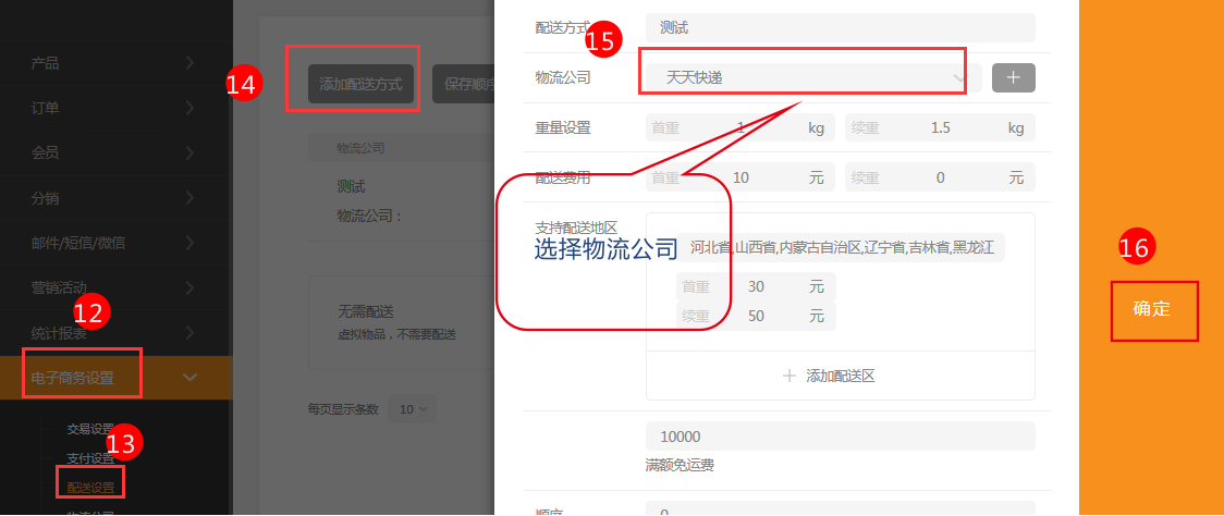 6.在電子商務(wù)設(shè)置-配送設(shè)置中,添加配送方式,選擇好相應(yīng)的物流公司。