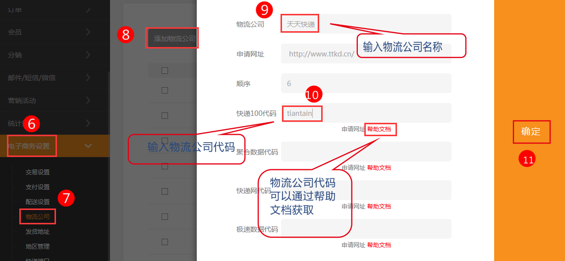 5,在電子商務(wù)設(shè)置-物流公司中添加物流公司名稱和代碼。