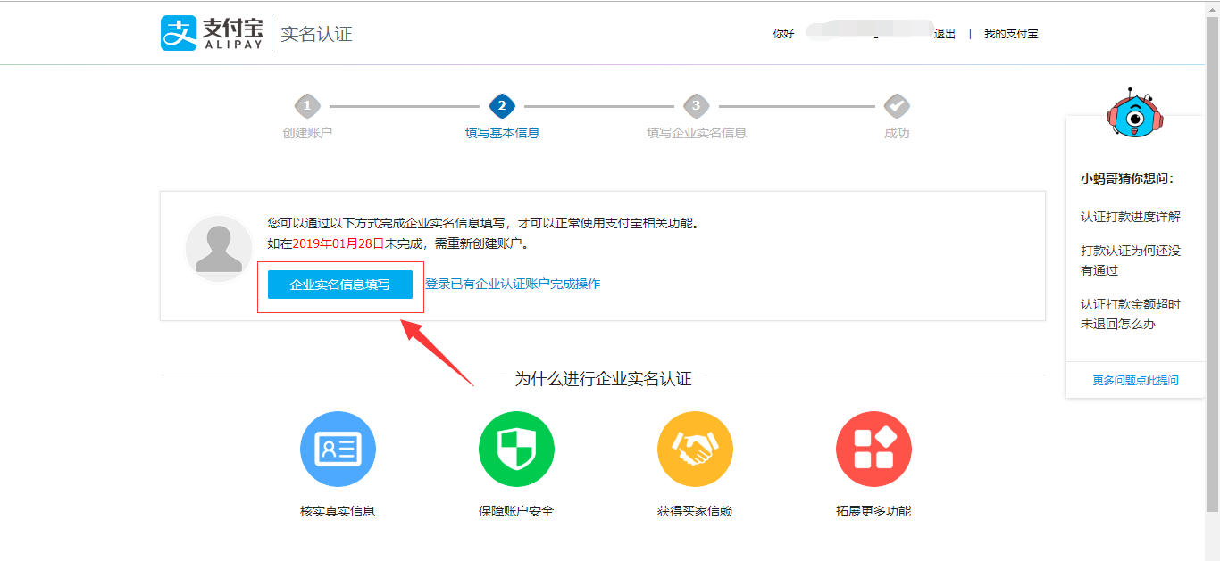 注冊賬號填寫郵箱賬號后,在郵箱中會收到一封郵件,點(diǎn)擊“繼續(xù)注冊”,填寫完所有信息后會出現(xiàn)“企業(yè)實(shí)名填寫頁面”,點(diǎn)擊進(jìn)入,填寫信息通過認(rèn)證即可,如圖所示: