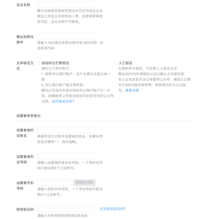 企業(yè):企業(yè)名稱,營業(yè)執(zhí)照注冊號,運營者姓名/身份證號/手機號,選擇 認證方式