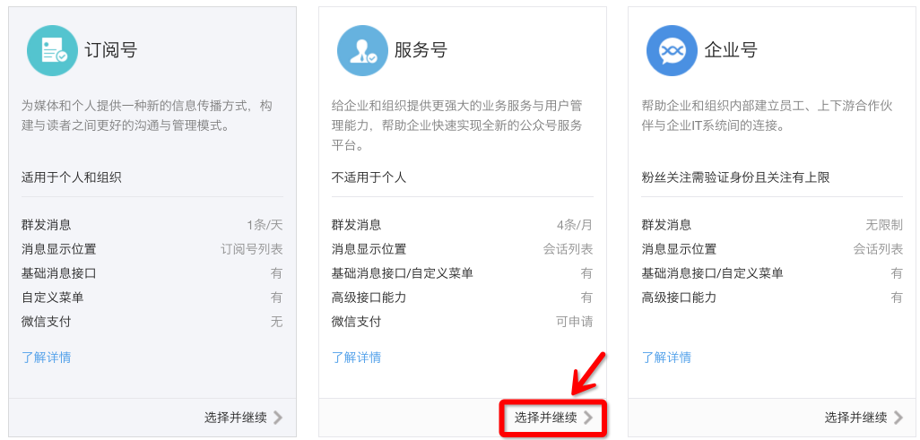 (3)選擇公眾號類型(訂閱號/服務號/企業(yè)號)