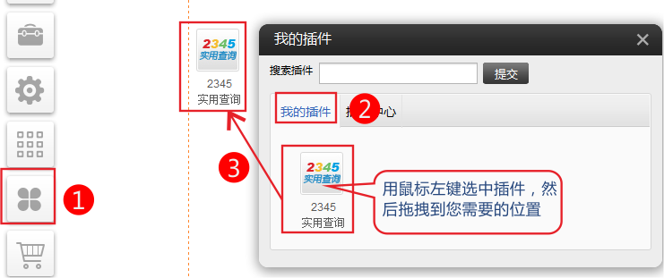 2、依次點擊插件-我的插件-選中“2345實用查詢”插件拖拽到您需要的位置。(如果“我的插件”中沒有,請到插件中心啟用)