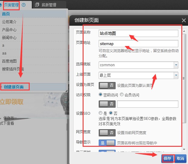 如果沒有ftp以企業(yè)建站為例,復(fù)制超級(jí)鏈接代碼 然后先進(jìn)入網(wǎng)站編輯 在頁面管理-》創(chuàng)建新頁面 -》頁面名稱填站點(diǎn)地圖 頁面地址寫sitemap -》底板選擇sitemap 導(dǎo)航是否顯示設(shè)置為否 然后保存