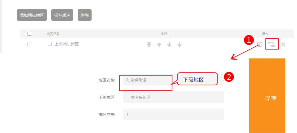 保存后,在列表中點(diǎn)擊添加二級(jí)地區(qū)