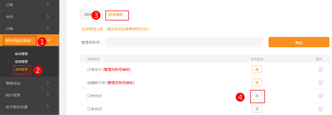 2、后臺微信模板設(shè)置中編輯、并開啟