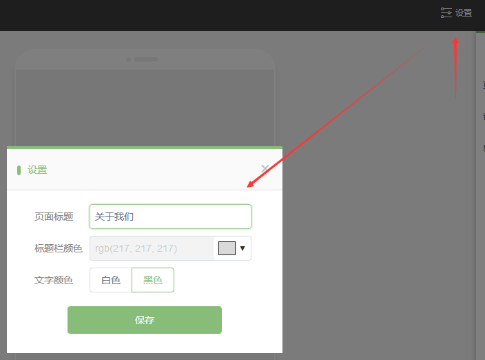 點擊頂部的設(shè)置按鈕可以設(shè)置當(dāng)前頁面標(biāo)題、標(biāo)題欄顏色,文字顏色等