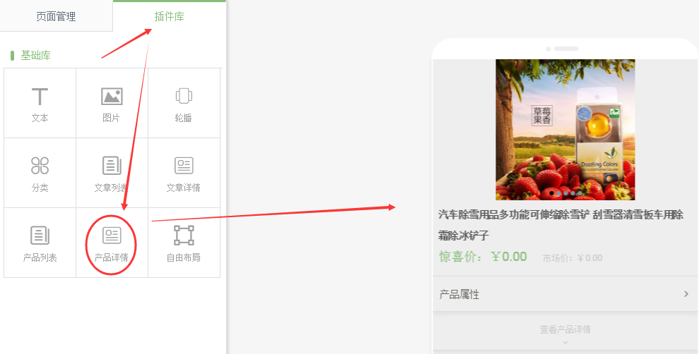 插件庫中,將產(chǎn)品詳情拖拽到頁面中