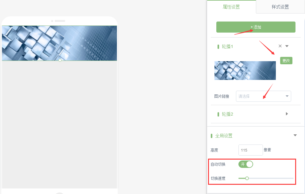 雙擊輪播模塊,可以添加輪播欄目,更換輪播圖片,設(shè)置是否自動切換,以后切換速度等