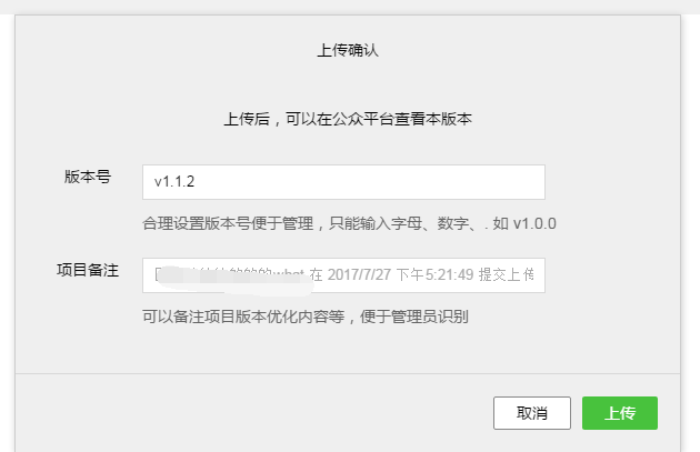 ⑤.點擊上傳按鈕,再次確認(rèn)版本信息,填寫版本號和項目備注