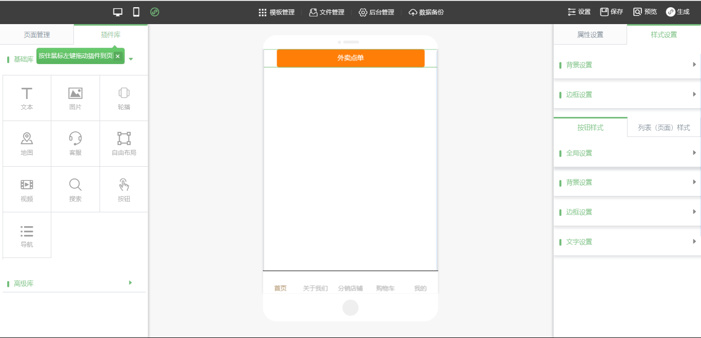 4.在小程序編輯頁面,拖入“外賣點(diǎn)單”插件,可以對(duì)該插件進(jìn)行“屬性設(shè)置”及“樣式設(shè)置”,設(shè)置完成后,點(diǎn)擊保存即可,如圖所示: