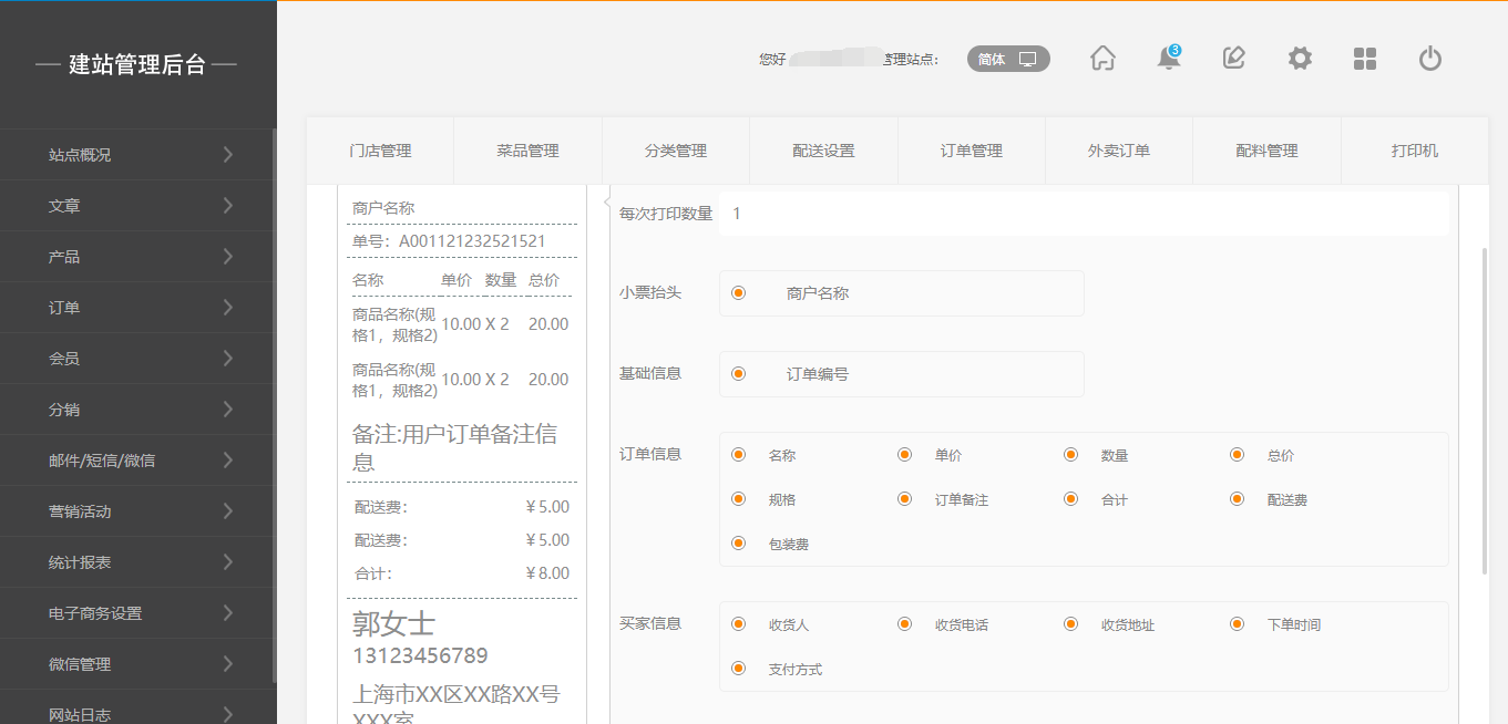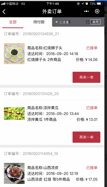 6.選擇任意店面,點(diǎn)擊進(jìn)入后,選擇相應(yīng)菜品,點(diǎn)擊并購買,若在后臺(tái)選擇的為“自動(dòng)接單”,則用戶付款完成后,后臺(tái)則會(huì)自動(dòng)接單,打印機(jī)也會(huì)打出相應(yīng)的小票,在會(huì)員中心中,可以看到相應(yīng)的訂單信息以及配送外賣的信息,在后臺(tái),訂單接單完成之后,不能進(jìn)行退款操作如圖所示: