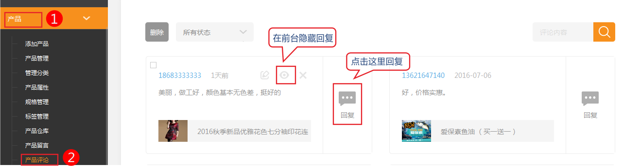 評(píng)論內(nèi)容顯示在商品詳細(xì)頁,店主可以決定評(píng)論的是否顯示及回復(fù)。ps:為保證信息安全,用戶評(píng)論默認(rèn)不展示,需要網(wǎng)站管理員審核后點(diǎn)擊顯示按鈕后前臺(tái)才會(huì)顯示相應(yīng)評(píng)論。