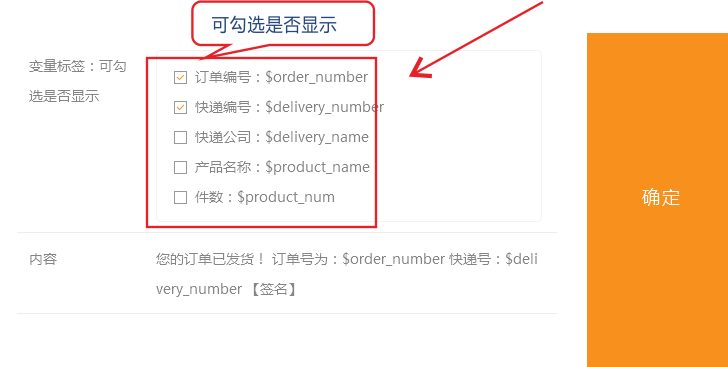 在建站后臺,“郵件/短信/微信”-“短信”-“短信模板”中新增了小程序外賣訂單,變量標(biāo)簽為:店鋪名稱、訂單號、商品名稱、實付金額、配送方式。如圖所示: