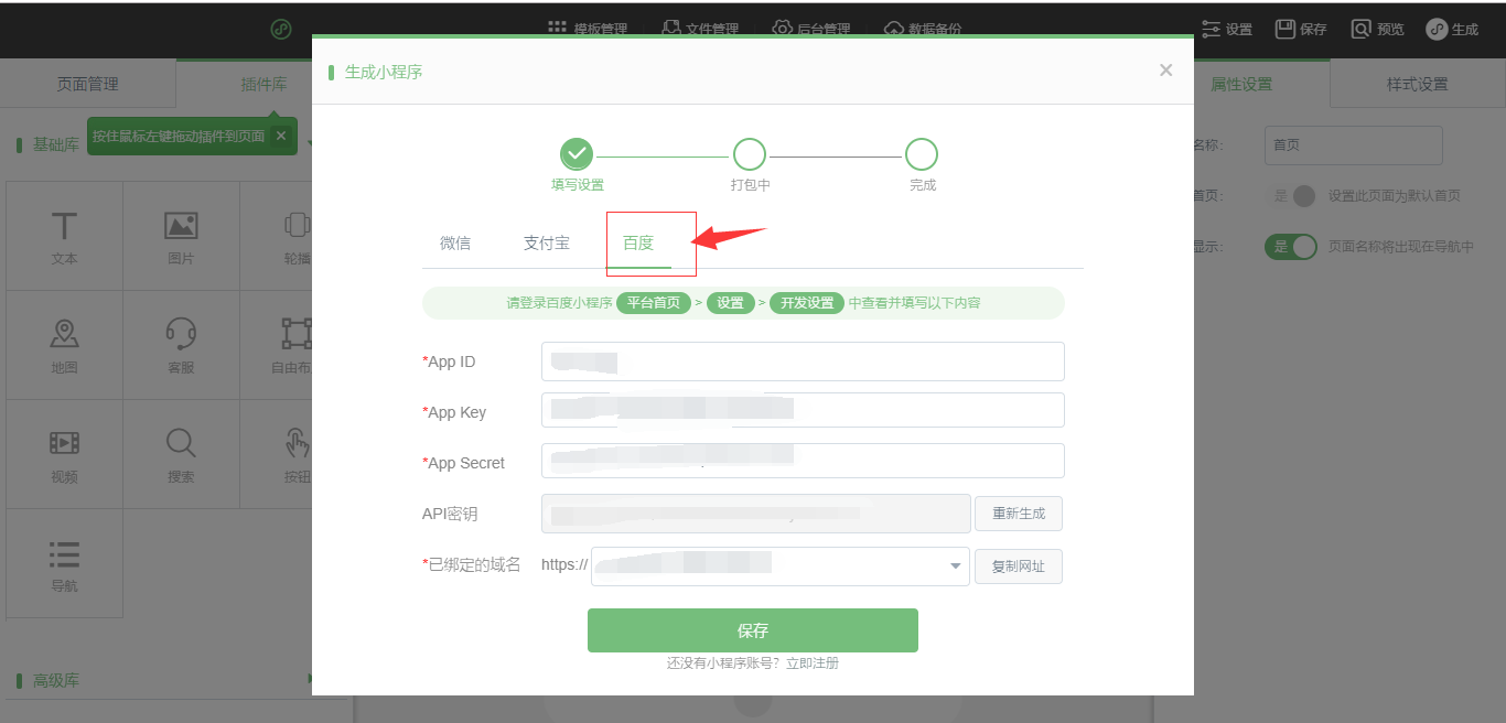 在網(wǎng)站后臺(tái)點(diǎn)擊生成 -》百度小程序 然后獲取域名